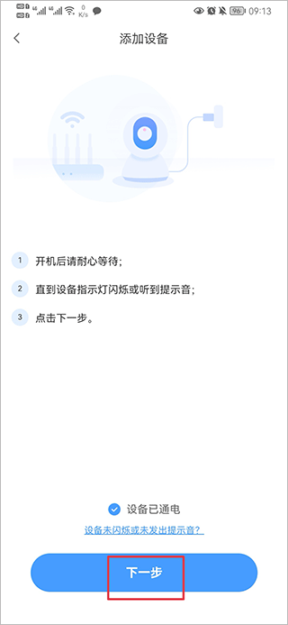 四、按照提示将设备通电后点击下一步