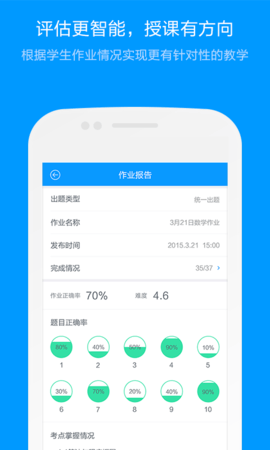 猿题库老师版是一款非常实用的作业题库软件,它不仅能够评估学生的学习情况,还能够根据学生的作业情况进行更加有针对性的教学。这个软件的最大特点就是能够在线交作业,并且系统会自动批改作业,全面分析每一个学生对知识点的掌握情况。从而老师就不需要花费大量的时间去批改作业了,而且还能够更加准确地了解每个学生的学习情况。