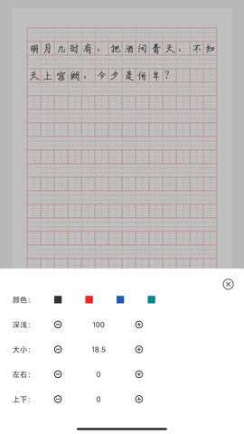 猫鱼字帖提供了4款精美的字帖模板,用户可以保存到相册,还可以打印出来。用户还可以调整文字颜色、文字深浅、格子类型等等,实现可打印和定制的字帖。