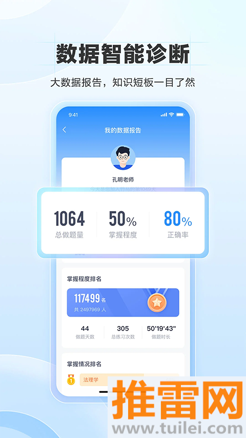 每天刷完后生成报告,告诉你哪些章节弱、排名情况、复习建议,全是大数据算出来的,查缺补漏特别准。