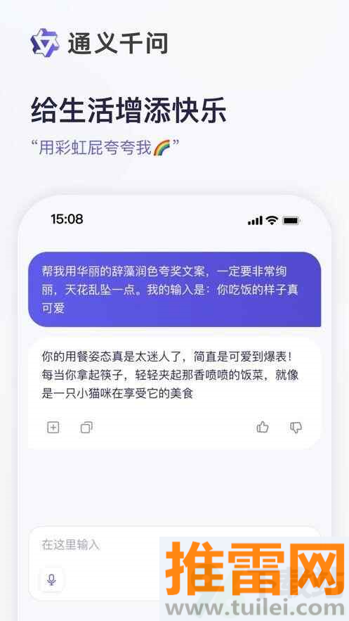 脑子里有什么问题,直接问通义千问就行,它就像个什么都懂的朋友,不管是写方案没思路,还是计划周末去哪儿玩,它都能给你靠谱的建议,聊得多了,它好像也越来越懂你,推荐的东西也更对胃口,让你感觉身边多了个聪明又能干的助手。