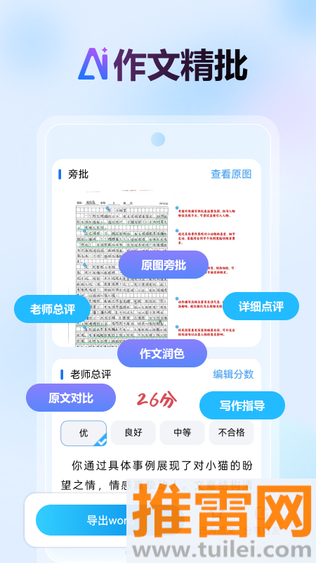 答:老师可以将批改好的详细报告单独导出并分享给学生,让他们清楚知道自己文章的优缺点。