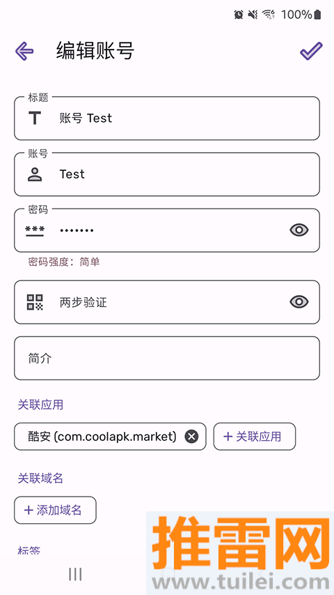 3、接下来就可以开始添加你的账号密码了,在新建的时候把对应的App或者网站域名填好,方便以后自动填充。