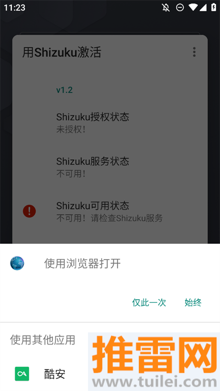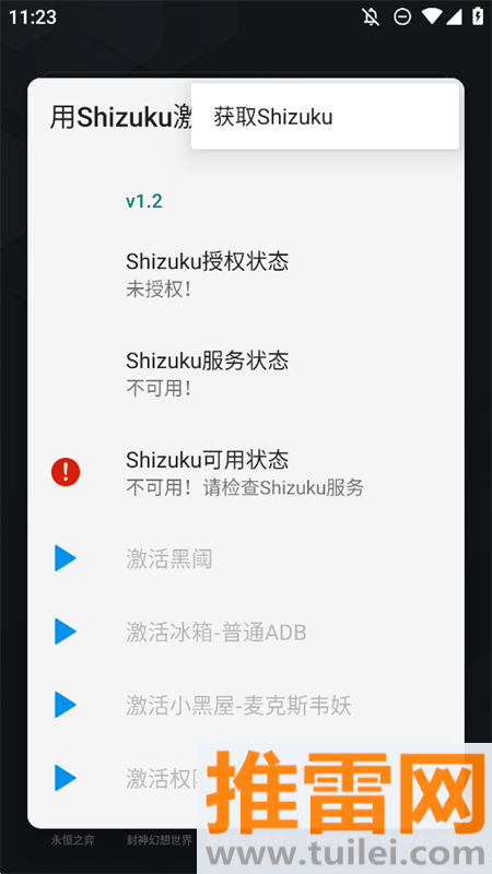 答:最常见的原因是你手机里的Shizuku服务没有成功启动,请先去Shizuku应用里检查一下它的运行状态。