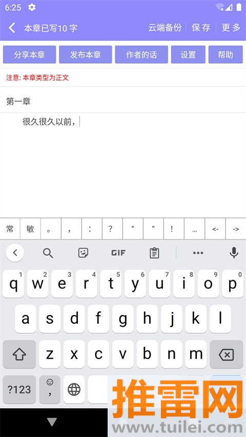 1、打开云吞App注册登录后,点创作入口新建小说,输入书名和大纲框架就开始码第一章,随时保存不丢。