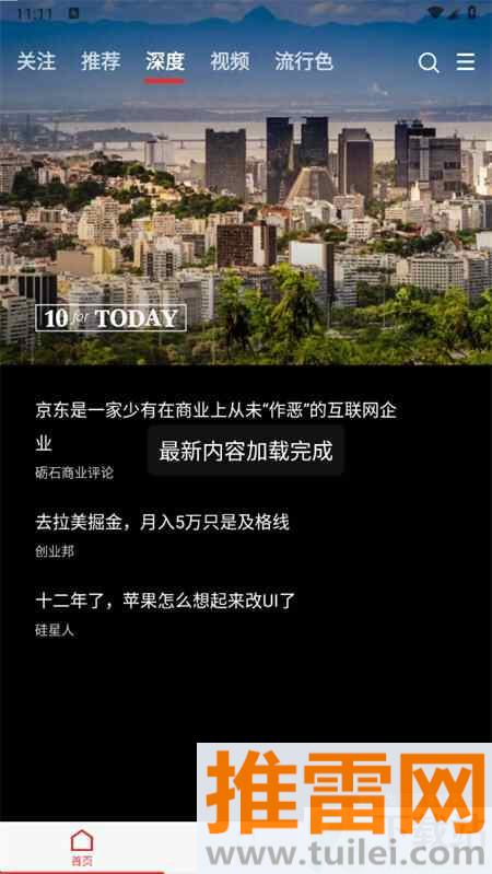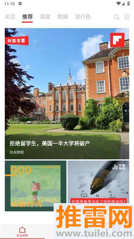 2、完成偏好设置后进入主页面,页面上方是分类导航栏,下滑屏幕可以连续浏览推荐文章,点击任意一条标题即可进入详情页。
