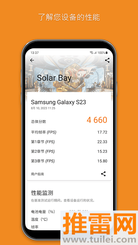 通过运行专业的测试项目,给手机的图形和处理性能打出一个直观的分数。
