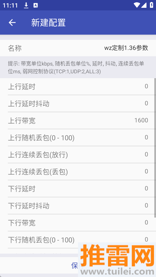 2、先拖“带宽限制”滑杆,再设“延迟+丢包”,最后点保存配置,起个名方便下次调用。