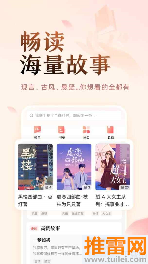 从浪漫爱情到惊悚悬疑,从职场现实到天马行空的幻想,丰富的内容分类满足不同读者的阅读需求。