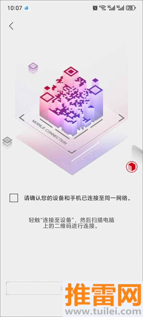 2、点开电脑上的连接按钮后会跳出来一个二维码,这时候举起你的手机,用App里的扫一扫功能对着屏幕扫一下,两边就算接上头了。