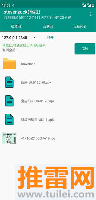 局域网精灵app最新版重写内核的局域网小钢炮,同一WiFi下它就是你的随身NAS,不用数据线、不用蓝牙配对,更不吃流量,点一下“添加”,手机立刻变Web服务器,照片、压缩包、大视频想甩谁就甩谁,界面干净到零广告,老人机都能看懂,传10G蓝光原盘比用U盘拷还快,进度条一拉到底,顺带把打印机共享、远程桌面、HTML托管全打包,办公室临时打印、宿舍开黑遥控、会议秒投文件,一只APP全兜底。