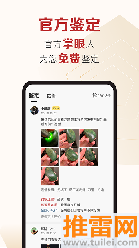 上传玉件照片视频,官方鉴定师给出专业意见,还经常请行业大咖一起看,帮你避坑辨真假。