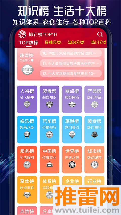 覆盖中国十大品牌、知识榜、趣闻榜等各类TOP10榜单,数据详细有依据。