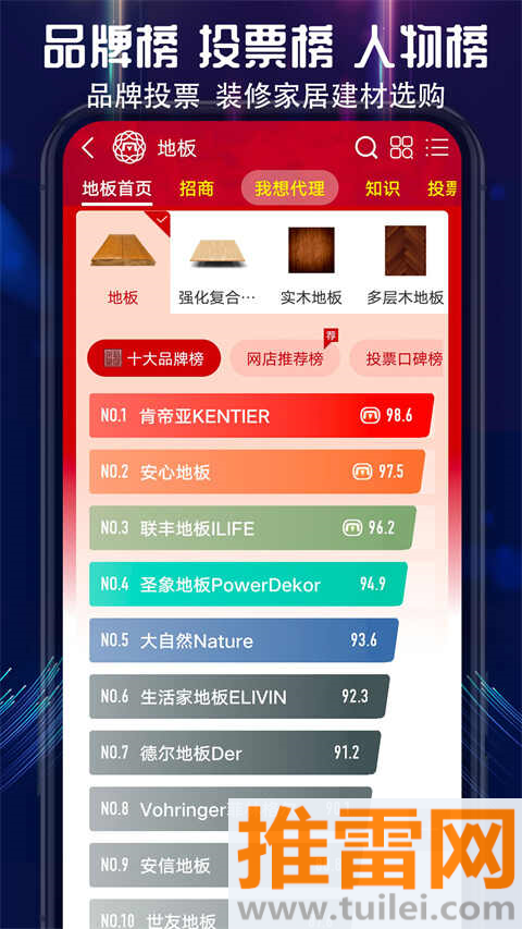 2、在首页点击任意排行榜分类,比如“十大瓷砖品牌”,即可查看详细品牌介绍和评分。