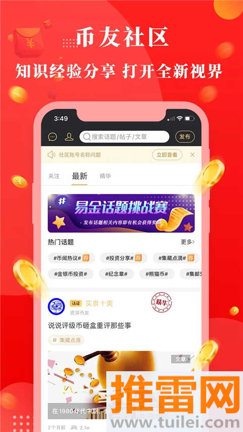 内置金币百科数据库,从1979年至今发行的纪念币信息一查便知,还能看历史成交价。