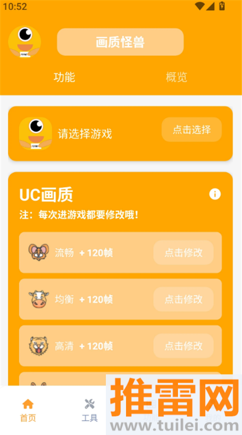 1、打开画质怪兽120帧App,首页选和平精英游戏,点进画质模式直接挑极速画质一键开启,系统提示成功就行。