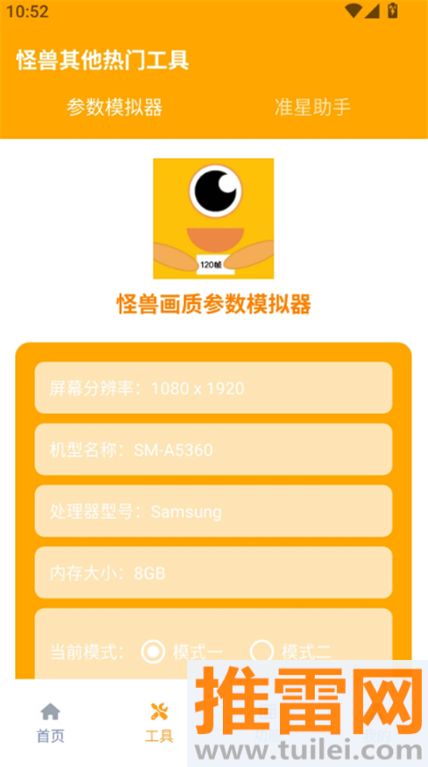 直接显示设备分辨率、机型处理器内存信息,切换模式一二模拟高低配置场景,适配自家手机参数。