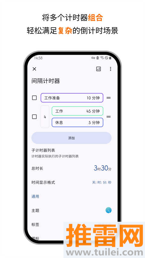 4、长按面板里的计时器能直接跳到它的设置界面,调时间铃声标签白噪音这些细节都随便改。