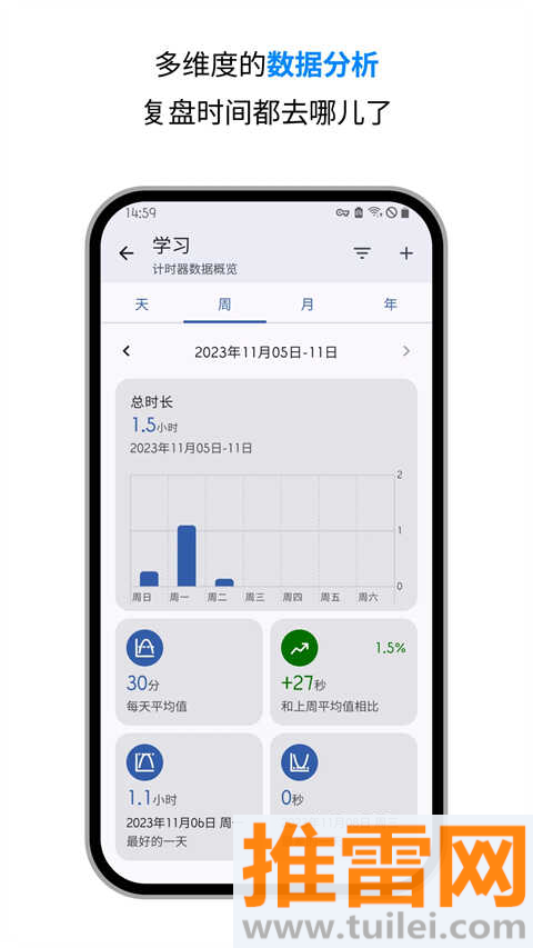 每用一次都自动记下来,按标签类型归类,柱状图饼图显示时间分布,帮你复盘效率。