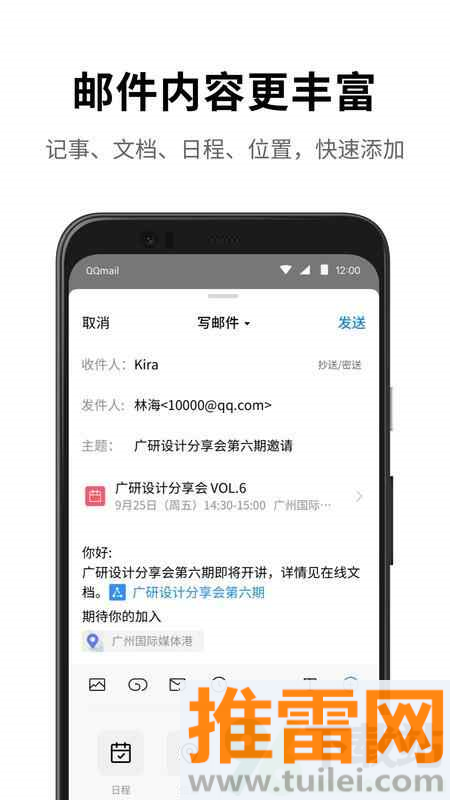 收到会议邀请邮件时,一键就能把日程添加到内置日历中,还会在开始前温馨提醒,再也不怕错过重要约会。