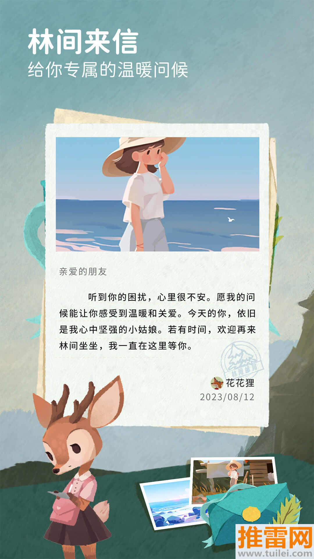 3、软件里有个特别暖心的设计,只要你在这里认真聊满五分钟,系统就会开启倒计时提醒,第二天准能收到一份专属的林间来信。