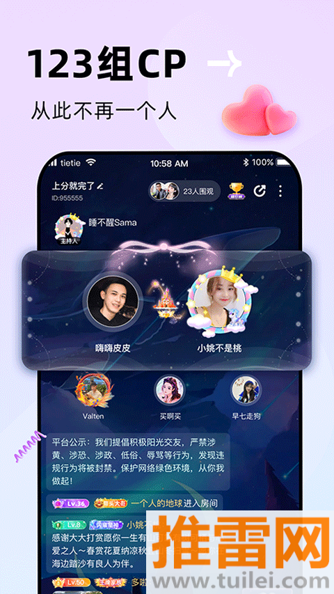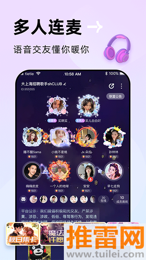 随时可以加入各种主题的语音聊天室,和大家一起连麦玩游戏、唱歌或者闲聊。