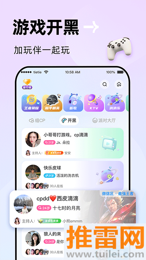 3、在语音房里,你可以和大家一起玩游戏开黑,或者找人甜蜜CPDD,玩法特别多。