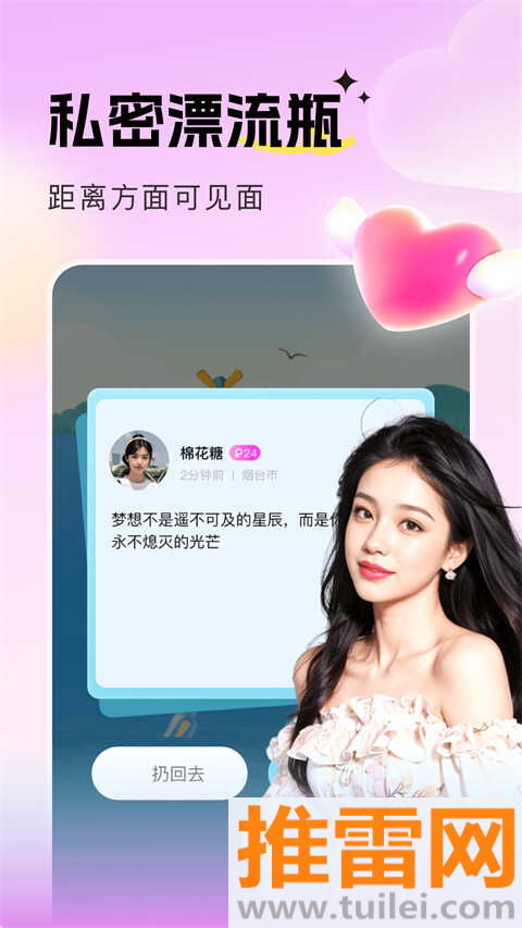 丢掉无聊,来场未知的浪漫邂逅吧,音麦漂流瓶带你体验别样的线上交友乐趣,这款应用不再是千篇一律的滑动匹配,而是将神秘感融入社交,让你通过一个个满载心声的语音或文字漂流瓶,与来自天南海北的灵魂相遇,将你的秘密、你的期待,甚至你对理想伴侣的想象,轻轻放进瓶中,投向茫茫人海,等待一个特别的人拾起,除了这独具匠心的漂流瓶玩法,想迅速拉近距离?那就试试同城交友功能,轻松锁定你身边的有趣灵魂,即刻开启心动聊天,这里更有真实身份认证保障,让你放心大胆去结识,不必担心照骗和虚假信息,不仅能文字畅聊,语音视频连线更让沟通生动起来,兴致来了,还能在线点歌为对方献唱,或是一起K歌嗨翻天,共享同一首歌的浪漫,让彼此的心更贴近。