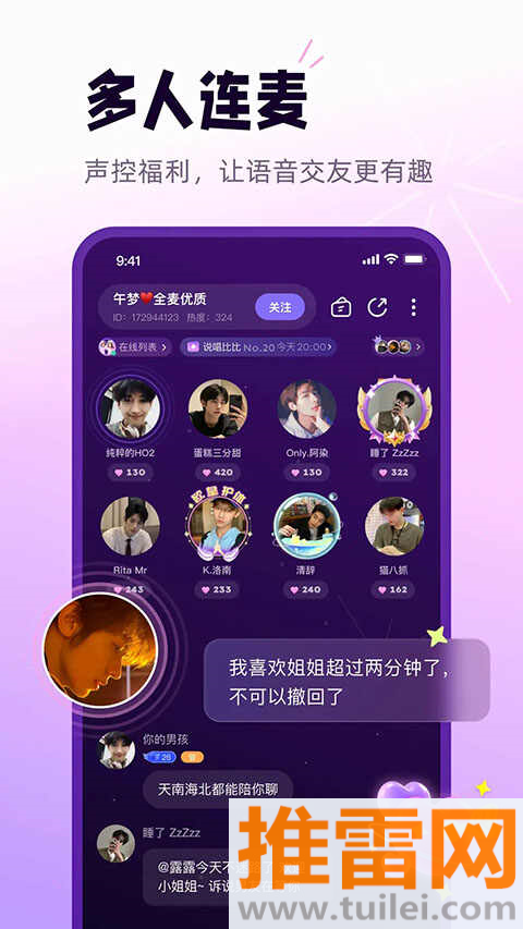 房间上限九人,支持轮流上麦,下面观众文字弹幕,不会抢话。