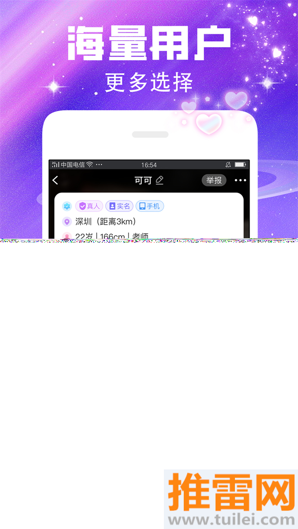 2、系统会根据你的条件专门给你推荐那些让你心动的人,遇到了喜欢的别犹豫,主动出击往往就有故事发生。