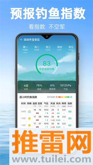 实时推送温度、气压、降水、月相,算出“钓鱼指数”,低于60分就老实回家洗衣服。