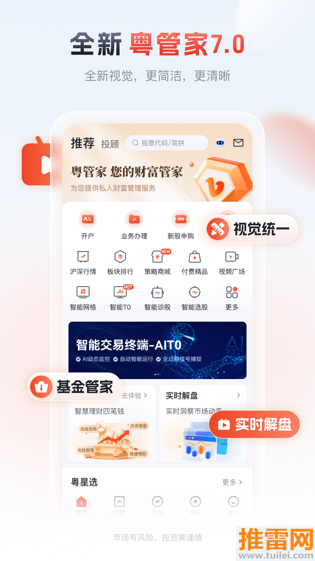 粤管家app其实就是大家伙儿熟知的粤开证券,这绝对是一款把客户体验放在心尖上的综合投资理财神器,它把咱们平时炒股理财需要的家当全给备齐了,从手机极速开户、查看高速行情,到普通交易、融资融券,再到买基金、看资讯、做账户分析,功能那是应有尽有,更贴心的是,它还专门搭建了投顾社区和智能投顾系统,甚至还有能兑换好礼的积分商城,真正实现了一个APP搞定所有投资需求,特别值得一提的是,这里头坐镇着不少专业的股市行家,专门给大伙儿深扒外资动向、国企板块的涨跌逻辑,提供实时的盘面解读,帮咱们散户把复杂的市场看个明明白白,力求让每一笔投资都能获得更理想的收益,随时随地享受这种专业又省心的财富管理服务。