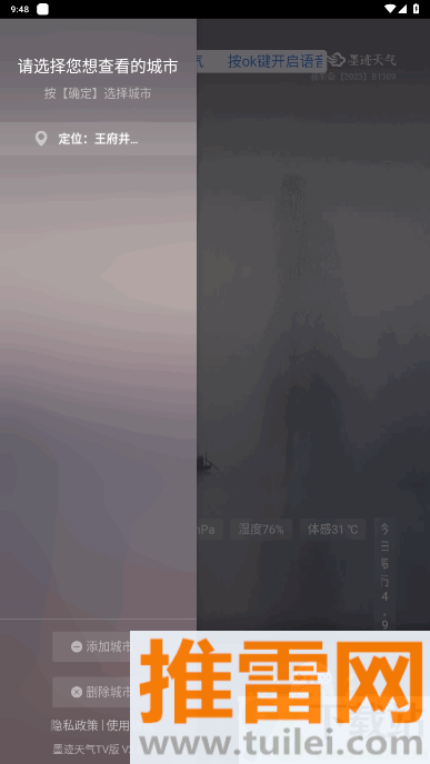 2、进入主界面后,用遥控器按一下方向左键,就能进到城市管理页面,这里可以删改当前城市或者加新地方。