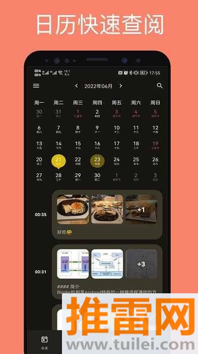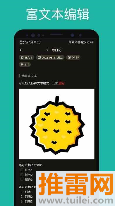 榴莲日记App是给那些想安安静静写点东西的人准备的,不用联网、不推广告、不搞花里胡哨的社交功能,打开就能写,写完自动锁上,只有你自己能看,不管是随手记下今天的心情、工作上的待办,还是贴张照片配上几行字留个纪念,它都接得住,界面清爽得像一张白纸,但背后藏着指纹锁、回收站、标签分类这些实用细节,既轻便又靠谱,名字就叫“榴莲日记”,听着有点怪,用起来却意外地顺手,尤其适合不想被打扰、只想和自己对话的人。