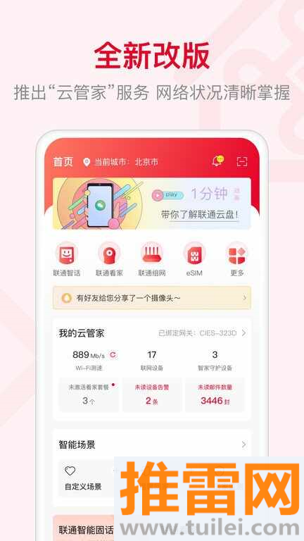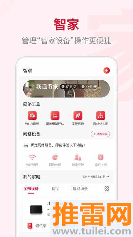 联通智家app是咱们家庭网络的万能遥控器,以前想查个网费、测个网速还得打客服或者登那个慢吞吞的网页,现在手机上下个这软件,这些事儿动动手指全搞定,而且它不光是管宽带的,连你家里的智能摄像头、云盘存储,甚至话费套餐都能一块儿管了,说白了,它就是想让你不用出门也不用求人,自己在家就能把这些跟网有关的琐事儿全给料理得明明白白。