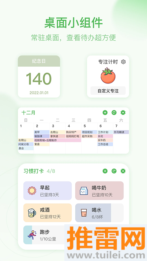 起床、喝水、运动、早睡等自定义习惯,到点弹窗+震动,连续打卡生成“链条”,断签一键备注原因,防止破罐子破摔。