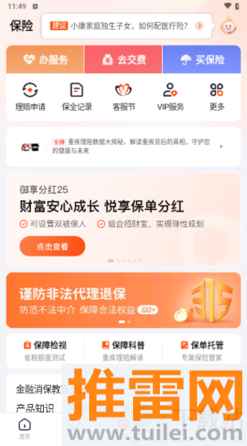 2、首页下滑可见常用功能快捷入口,左右滑动切换保险、理财、健康三大核心服务模块。