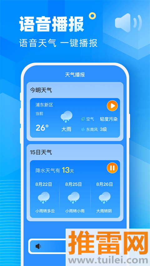 一键语音播报当前和未来天气,语速清晰、发音标准,老人小孩听几遍就能懂,不用盯着屏幕看。