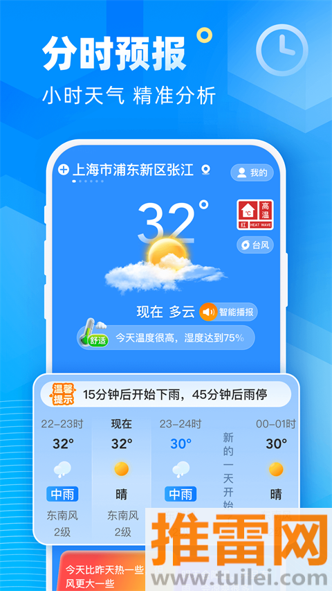 3、需要语音播报就点首页大大的“播报”按钮,软件会用清晰女声读出当前和未来几小时天气。