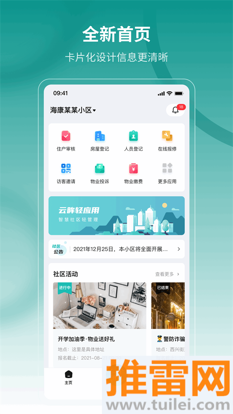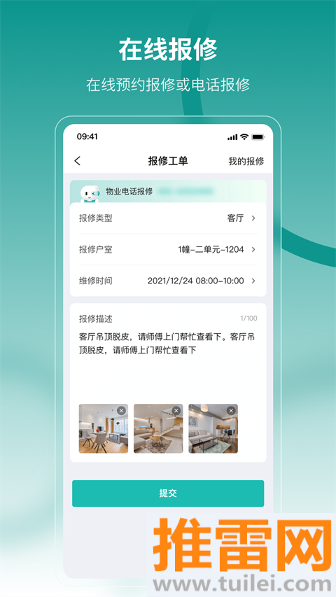 物业公告、通知、问题反馈、投诉建议全在App里,报修拍照上传,物业在线接单处理,进度实时可见。