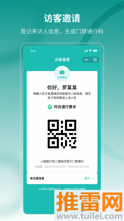 家人朋友来访提前在App里预约,生成二维码给对方,对方扫码就能进小区大门和楼栋,物业审核也在线完成。