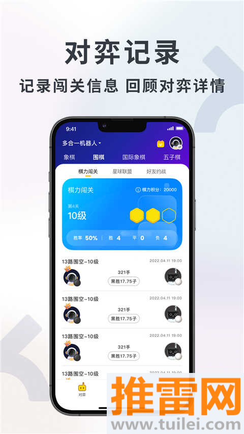4、下完一局APP自动同步棋谱,点历史记录回顾详情,看AI打谱分析吻合度,或者挑习题残局继续练手。
