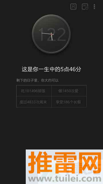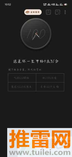 2、开启死之钟功能,选择一个你认为的寿命年龄,此时你可以看到你当前的年龄相对于设定的预期寿命的时分,还能看到剩余的餐数、周末数、长假数等。