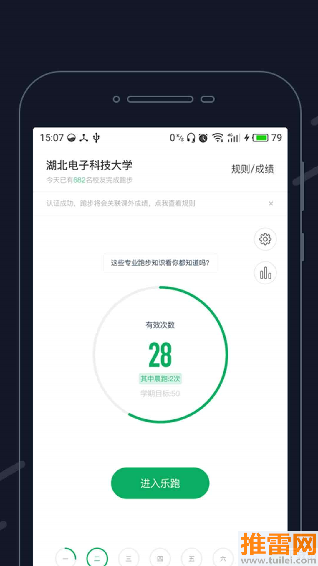 3、身份审核通过后返回首页,点击“开始乐跑”按钮,系统会自动开始定位并记录你的跑步轨迹和实时数据。