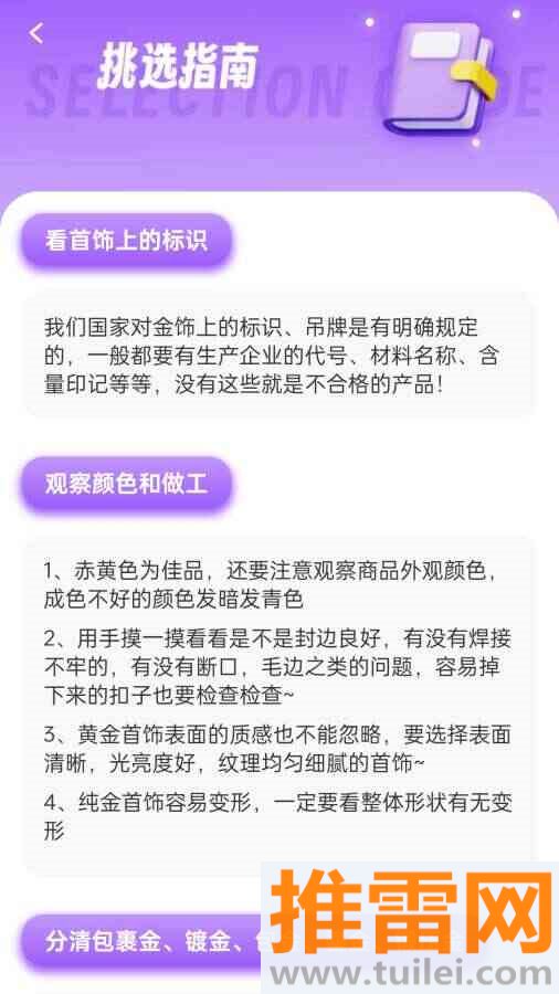 1、汇集了特别全面的金器知识库,从金饰的历史寓意到选购要点全都有,让你在买金子的时候心里有底,不做冤大头。