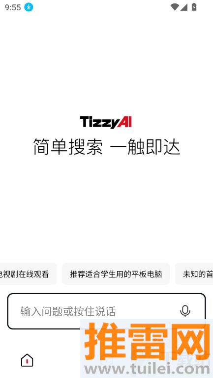 1、打开Tizzy.ai智能搜索助手后,在首页中间的搜索框里输入你感兴趣的影视剧名称或者演员名字,系统会自动推荐相关内容。
