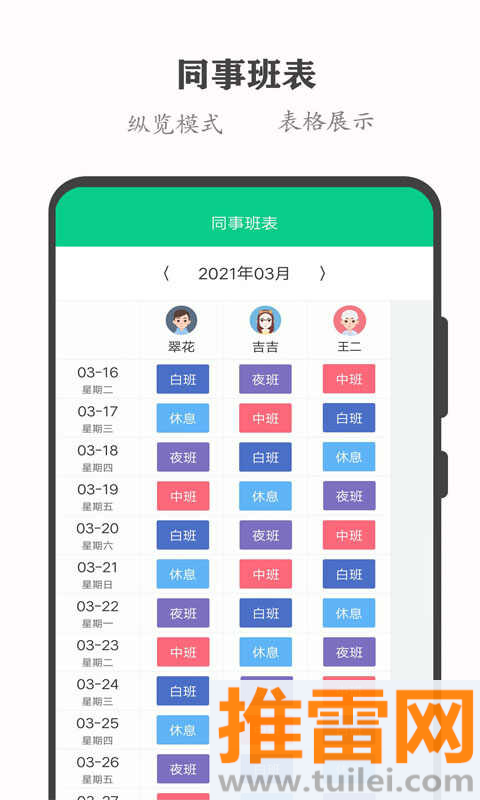 1、班表颜色支持自定义,夜班黑底荧光绿,白班白底蓝字,一眼看出今天累不累。