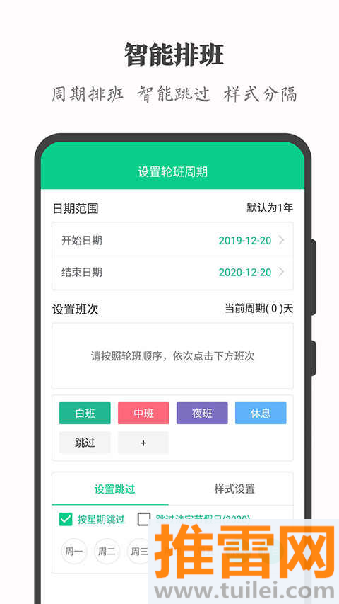 按周期输入“白夜休休”这类口诀,一键铺满整月,支持手动拖拽改班。
