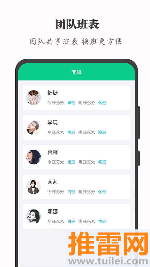 2、团队码七位随机,同事输入即可共享排班,离职退出后班表自动对其隐藏。