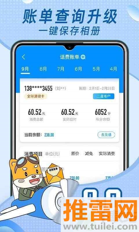 4、个人账户界面清晰展示话费余额、流量剩余和积分情况,消费记录随时可查。